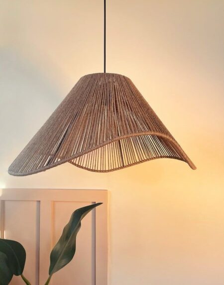 Lámpara tipo araña de diseño vertical alargado, tejida a mano con fibra natural sobre una estructura metálica robusta. Su forma estilizada y simétrica, combinada con un patrón geométrico artesanal, la hace perfecta para espacios de doble altura, pasillos elegantes o proyectos arquitectónicos que buscan una pieza central impactante y natural.